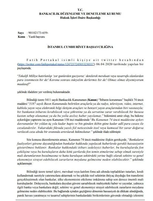 Bankacılık Düzenleme ve Denetleme Kurumu (BDDK), Fox TV Ana Haber sunucusu Fatih Portakal hakkında İstanbul Cumhuriyet Başsavcılığı'na suç duyurusunda bulundu. BDDK tarafından yapılan yazılı açıklamada; “Twitter adlı sosyal medya platformunda 6 Nisan 2020 tarihinde Fatih Portakal tarafından yapılan paylaşımda, ülkemiz bankacılık ve finans sistemine yönelik gerçeğe aykırı ve maksatlı ifadelere yer verildiği görülmüştür” denildi