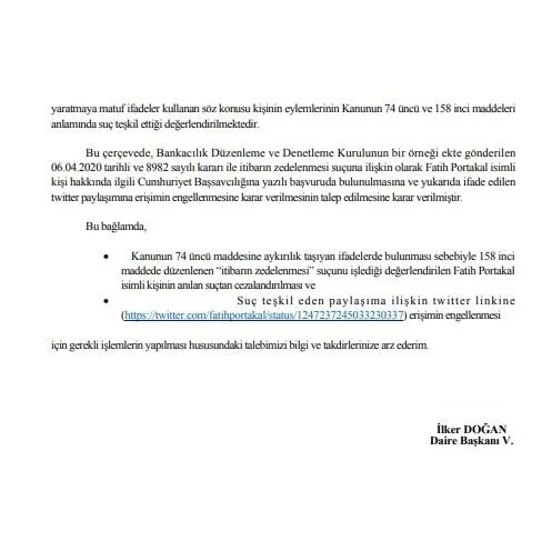 "Bu kapsamda söz konusu şahıs (Fatih Portakal) hakkında kanunun 162'nci maddesi uyarınca Kurul tarafından suç duyurusunda bulunulmasına karar verilmiştir. Gerçeğe aykırı ve dedikodu niteliğindeki ifadelere ilişkin olarak bankalarımızın ve ekonomimizin itibarını zedeleyebilecek veya sektörümüze zarar verebilecek nitelikteki benzer paylaşımlar hakkında bundan sonra da gerekli yasal yollara başvurulacağı tabiidir. Kamuoyuna saygı ile duyurulur."