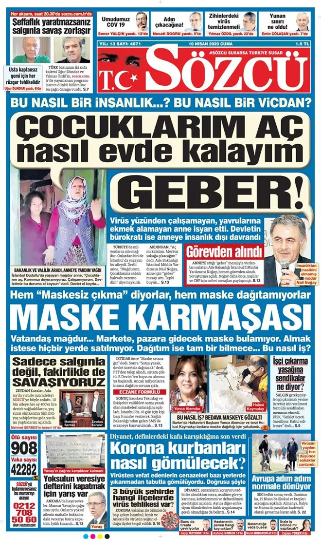Sözcü, devlet sanki söz konusu bürokratın çirkin söyleminin üzerine yatmış gibi bir tavır talilınarak olay üzerine devlet yetkililerinin attığı adımları görmezden gelerek "Çocuklarım aç nasıl evde kalayım, GEBER"manşetini attı. Söz konusu bürokratın görevden alındığı ufak puntolarla büyük manşetin yanında geçiştirildi.