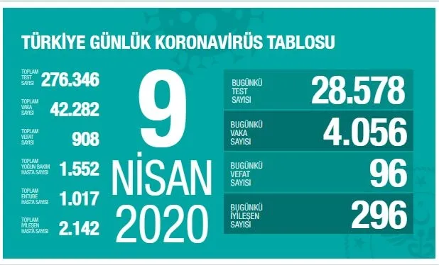 Bakan Koca, 10 Nisan Türkiye corona virüsü tablosunda; 30 bin 864 koronavirüs testinden 4 bin 747'sinin pozitif çıktığını, 98 hastanın yaşamını yitirdiğini, 281 hastanın da iyileştiğini söyledi. Bakan Koca, toplam test sayısının 307 bin 210, toplam vaka sayısının 47 bin 029 , toplam yoğun bakım hasta sayısının bin 667, toplam iyileşen hasta sayısının 2.423 olduğunu bildirdi.