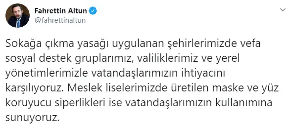 Altun yaptığı paylaşımında vatandaşların temel ihtiyaçlarının karşılandığını vurgulayarak "Sokağa çıkma yasağı uygulanan şehirlerimizde vefa sosyal destek gruplarımız, valiliklerimiz ve yerel yönetimlerimizle vatandaşlarımızın ihtiyacını karşılıyoruz. Meslek liselerimizde üretilen maske ve yüz koruyucu siperlikleri ise vatandaşlarımızın kullanımına sunuyoruz." ifadelerine yer verdi