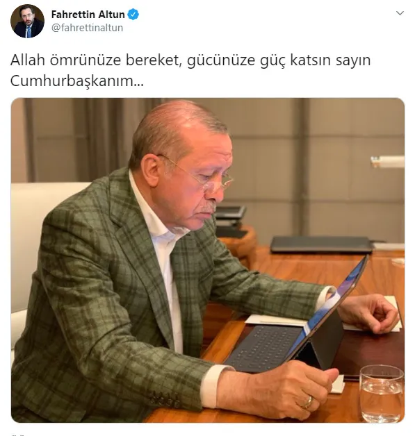 Twitter'dan yaptığı paylaşımda, Cumhurbaşkanı Erdoğan'ın Huber Ofisi'nde çekilen fotoğrafına yer veren Altun, "Allah ömrünüze bereket, gücünüze güç katsın Sayın Cumhurbaşkanım." ifadesini kullandı.