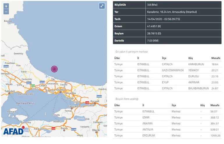 Gelen son dakika haberine göre, gece saat 02.56'da İstanbul'un çeşitli noktalarından hissedilen şiddetli bir deprem meydana geldi. AFAD ve Kandilli Rasathanesi tarafından İstanbul'da hissedilen deprem hakkında son dakika notu ile bilgi paylaşıldı. AFAD, depremin merkez üssünün İstanbul'un Karadeniz kıyısı açıkları olduğunu duyururken şiddetini 3.8 olarak açıkladı. AFAD ayrıca, depremin İstanbul'daki merkez üssünün Karadeniz'in Arnavutköy açıkları olduğunu ve 7.03 km derinlikte gerçekleştiğini bildirdi.