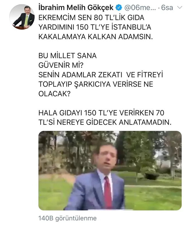 Gökçek, Ekrem İmamoğlu'na hitaben, 80 liralık gıda yardımını 150 liraya İstanbul'a kakalamaya kalkan adamsın, bu millet sana güvenir mi? Senin adamlar zekâtı ve fitreyi toplayıp şarkıcıya verirse ne olacak? Hala gıdayı 150 liraya verirken, 70 lirayı nereye gidecek anlatamadın" dedi.