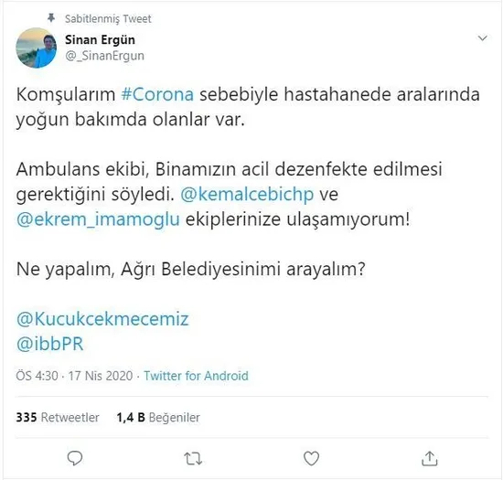 "Komşularım #Corona sebebiyle hastahanede aralarında yoğun bakımda olanlar var. Ambulans ekibi, Binamızın acil dezenfekte edilmesi gerektiğini söyledi. @kemalcebichp ve @ekrem_imamoglu ekiplerinize ulaşamıyorum! Ne yapalım, Ağrı Belediyesinimi arayalım?"