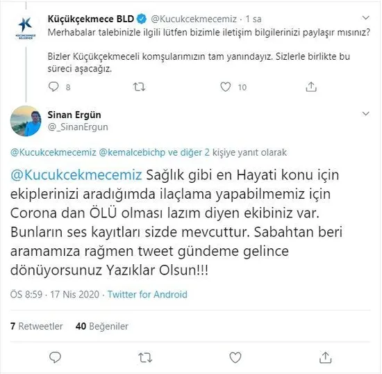 Siman Ergün kendisi ile irtibat kurmaya çalışan ve adres isteyen CHP'li belediye görevlilerine: "@Kucukcekmecemiz Sağlık gibi en Hayati konu için ekiplerinizi aradığımda ilaçlama yapabilmemiz için Corona dan ÖLÜ olması lazım diyen ekibiniz var. Bunların ses kayıtları sizde mevcuttur. Sabahtan beri aramamıza rağmen tweet gündeme gelince dönüyorsunuz Yazıklar Olsun!!!"diye cevap verdi.