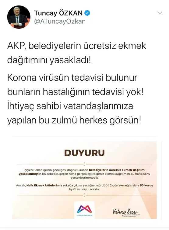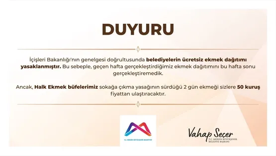 Mersin Büyükşehir Belediyesi; sosyal paylaşım sitesi Twitter'daki kurumsal hesabından açıklamada bulundu ve "İçişleri Bakanlığı'nın genelgesi doğrultusunda sokağa çıkma yasağı sürecinde belediyelerin ekmek dağıtması yasaklanmıştır. Yasağın sürdüğü hafta sonu boyunca Halk Ekmek büfelerimizde ekmek fiyatı 50 kuruş olarak belirlenmiştir" iddiasında bulundu.