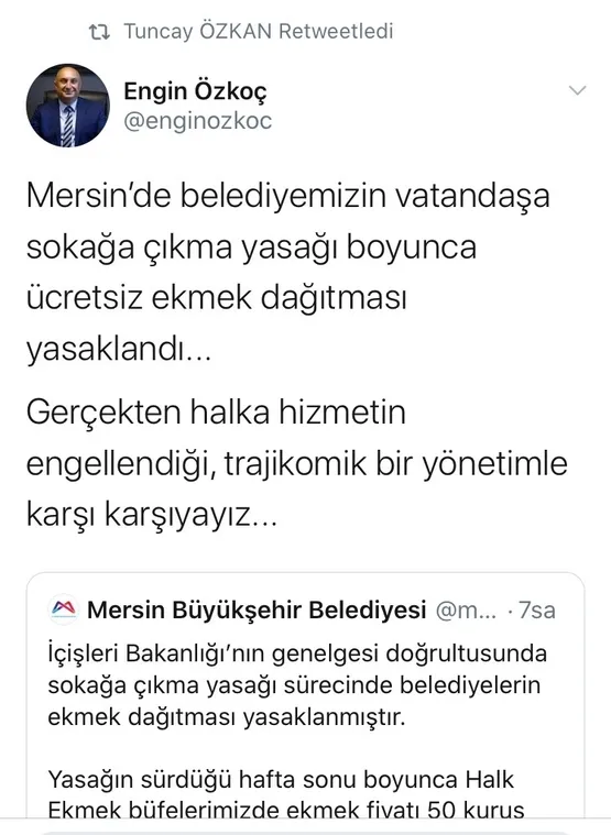 CHP Grup Başkanvekili ve Sakarya Milletvekili Engin Özkoç da, Mersin'de belediyemizin vatandaşa sokağa çıkma yasağı boyunca ücretsiz ekmek dağıtması yasaklandığını öne sürerek, "Gerçekten halka hizmetin engellendiği, trajikomik bir yönetimle karşı karşıyayız..." iddiasında bulundu.