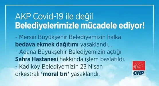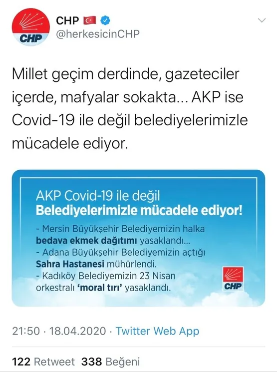 CHP Genel Merkezi'nin kurumsal hesabı da, söz konusu yalana ortak oldu ve "AKP Covid ile değil belediyelerimizle mücadele ediyor. Mersin Büyükşehir Belediyemizin halka bedava ekmek dağıtımı yasaklandı" iddiasında bulundu.