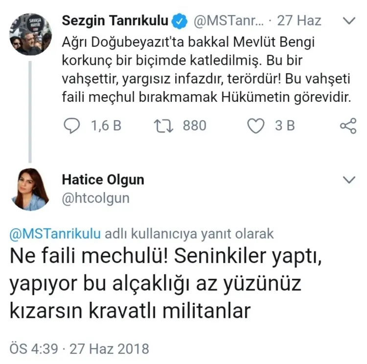 Tanrıkulu'nun sosyal medyadan attığı iletide PKK'nın adını geçirmemesinin bir savunma mekanizması olduğunu düşündüğünü belirten Olgun, "Bu şahsın teröristlere karşı Hendek'te, SİHA'lara karşı duruşu açıktı. Tanrıkulu'nun devletimizin terörle mücadelesinde askerlerimiz Güneydoğu'da şehit olduğunda üzüldüğünü düşünmediğim gibi Ağrı'da PKK'nın bir sivili, bir aile babasını, bir Kürt'ü şehit ettiğinde de üzüldüğünü sanmıyorum. PKK da katliamı üstlendiği halde, Tanrıkulu'nun pişkin pişkin "Bu vahşeti faili meçhul bırakmamak Hükümetin görevidir" diyerek devleti suçlaması insanı çileden çıkarıyor. Böylece PKK'yı koruyor, teröristlerin resmini yanı başına alıyor ve bunları yaparken insanları çileden çıkarıyor!" diye ifade etti.