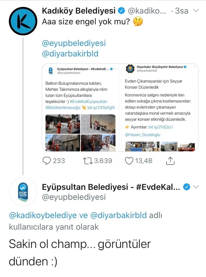 Kadıköy Belediyesi; sosyal paylaşım sitesi Twitter'daki resmi hesabından Diyarbakır Büyükşehir Belediyesi ve Eyüp Belediyesi'ni etiketleyerek, "Aaa size engel yok mu? @eyupbelediyesi @diyarbakirbldA" şeklinde soru yöneltti.