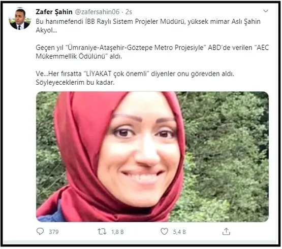 İBB Raylı Sistem Projeler Müdürü, yüksek mimar Aslı Şahin Akyol geçen yıl “Ümraniye-Ataşehir-Göztepe Metro Projesiyle” ABD’de verilen “AEC Mükemmellik Ödülünü” almıştı. Her fırsatta “liyakat çok önemli” diyen CHP’li Ekrem İmamoğlu, Akyol’u görevden aldı.