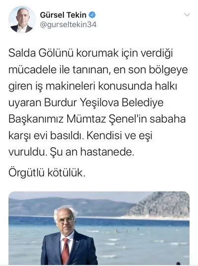 CHP İstanbul Milletvekili Gürsel Tekin: "Salda Gölünü korumak için verdiği mücadele ile tanınan, en son bölgeye giren iş makineleri konusunda halkı uyaran Burdur Yeşilova Belediye Başkanımız Mümtaz Şenel'in sabaha karşı evi basıldı. Kendisi ve eşi vuruldu. Şu an hastanede. Örgütlü kötülük."