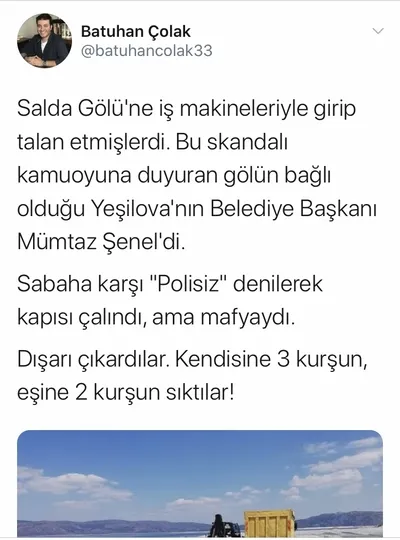 Gazeteci-Yazar Melis Alphan: "Salda Gölü'nün talan edilmemesi için verdiği mücadeleyle tanınan Burdur Yeşilova Belediye Başkanı Mümtaz Şenel ile eşi, bu sabaha karşı evleri basılarak silahlı saldırıya uğradı. Her ikisi de ameliyata alındı."