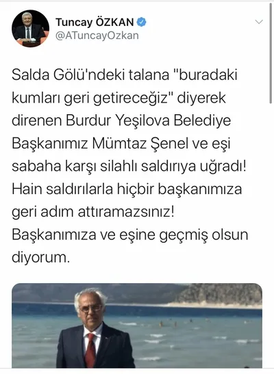 CHP Genel Başkan Yardımcısı ve İzmir Milletvekili Tuncay Özkan: "Salda Gölü'ndeki talana "buradaki kumları geri getireceğiz" diyerek direnen Burdur Yeşilova Belediye Başkanımız Mümtaz Şenel ve eşi sabaha karşı silahlı saldırıya uğradı! Hain saldırılarla hiçbir başkanımıza geri adım attıramazsınız! Başkanımıza ve eşine geçmiş olsun diyorum."