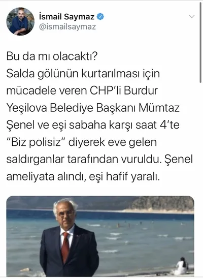Hürriyet Gazetesi eski muhabiri İsmail Saymaz: "Bu da mı olacaktı? Salda gölünün kurtarılması için mücadele veren CHP'li Burdur Yeşilova Belediye Başkanı Mümtaz Şenel ve eşi sabaha karşı saat 4'te "Biz polisiz" diyerek eve gelen saldırganlar tarafından vuruldu. Şenel ameliyata alındı, eşi hafif yaralı."