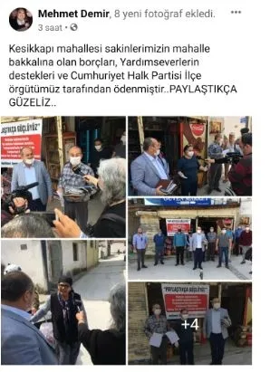 CHP'li ilçe başkanı bu konuyu sosyal medyadan da duyurdu. CHP'li Demir, "Kesikkapı Mahallesi sakinlerimizin mahalle bakkalına olan borçları, yardımseverlerin destekleri ve Cumhuriyet Halk Partisi ilçe örgütünüz tarafından ödenmiştir. Paylaştıkça güzeliz" diye paylaşım yaptı.