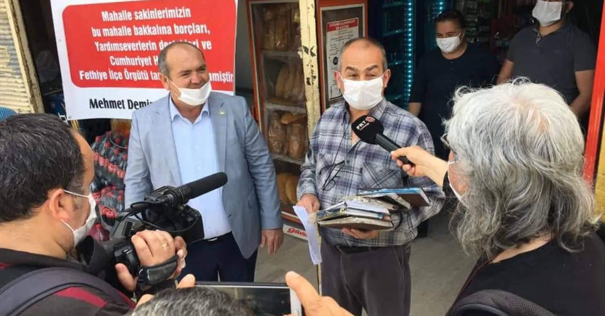 CHP Fethiye İlçe Başkanı Mehmet Demir basını davet ederek bakkaldan veresiye defterini satın aldı. Bakkal camına asılan pankart ile veresiye defterindeki borçların ödenmesi şova çevrildi.