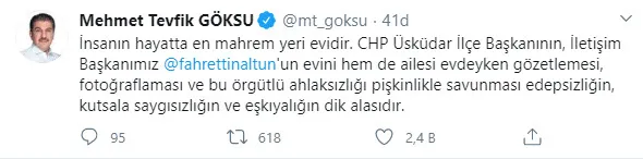 İstanbul Büyükşehir Belediye Meclisi AK Parti Grup Başkanvekili ve Esenler Belediye Başkanı Mehmet Tevfik Göksu da, sosyal medya hesabından tepki gösterdi. Göksu "@fahrettinaltun'un evini hem de ailesi evdeyken gözetlemesi, fotoğraflaması ve bu örgütlü ahlaksızlığı pişkinlikle savunması edepsizliğin, kutsala saygısızlığın ve eşkıyalığın dik alasıdır." dedi.