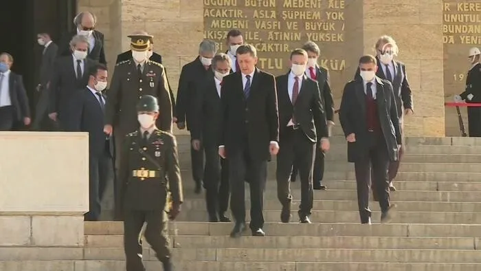 Heyettekiler maske takarken, Aslanlı Yol'daki yürüyüş, mozoleye çelenk bırakılması ve Anıtkabir Özel Defteri'nin imzalanması sırasında sosyal mesafe korundu.
