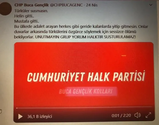 Direnişin direnişimizdir Mustafa. Katillerini tanıyoruz! Işıklar içinde uyu!" dendi. CHP Buca Gençlik Kolları'nın terör örtüğünün talimatıyla ölüm orucuna başlayanlara karşı ölümü kutsaması sosyal medyada devam etti. CHP'li gençler ölen DHKP-C'liler için ışıklar içinde uyuması temennisi taziye mesajında sunulurken, savcıyı şehit edenlerden olan Koçak'a emri DHKP-C verdiği halde katillerin aramız da dendi.