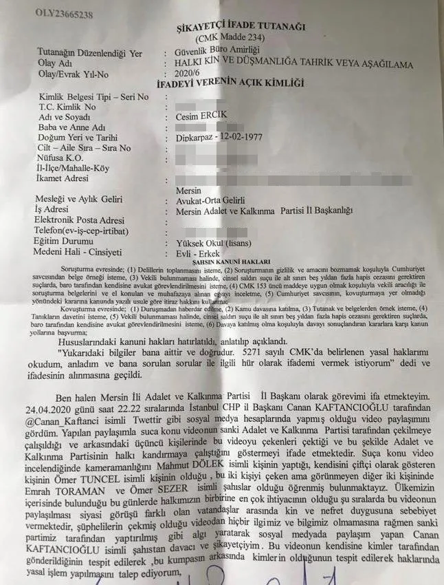 Tüm bu gerçeklerin ortaya çıkması ardından AK Parti Mersin İl Başkanı Cesin Ercik'in şikayeti üzerine savcılık harekete geçti. Dün emniyette ifade veren Cesim Ercik'in şikayeti ile başlatılan soruşturma çerçevesinde Mahmut Dölek, Ömer Tuncel ve Demokrat Parti eski İlçe Başkanı Emrah Toraman gözaltına alındı.