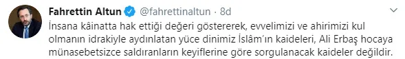Altun paylaşımında "İnsana kâinatta hak ettiği değeri göstererek, evvelimizi ve ahirimizi kul olmanın idrakiyle aydınlatan yüce dinimiz İslâm'ın kaideleri, Ali Erbaş hocaya münasebetsizce saldıranların keyiflerine göre sorgulanacak kaideler değildir." ifadelerine yer verdi