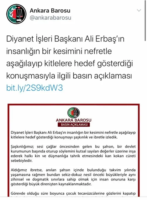 Ankara Barosu yazılı açıklamasında; Ali Erbaş'ı hedef aldı ve "Sesi çağlar öncesinden gelen ses" ifadeleriyle Müslümanların kutsal kitabı Kur'an-ı Kerim'de yer alan ayetlere hakaret etti. Ankara Barosu açıklamasında, İslam tarihinde kadın yakıldığına yönelik gerçek dışı bilgi paylaştı.