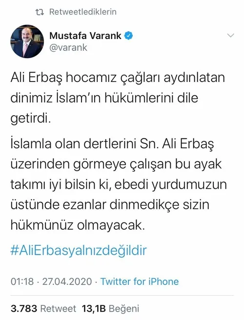 Sanayi ve Teknoloji Bakanı Mustafa Varank: "Ali Erbaş hocamız çağları aydınlatan dinimiz İslam'ın hükümlerini dile getirdi. İslamla olan dertlerini Sayın Ali Erbaş üzerinden görmeye çalışan bu ayak takımı iyi bilsin ki, ebedi yurdumuzun üstünde ezanlar dinmedikçe sizin hükmünüz olmayacak."