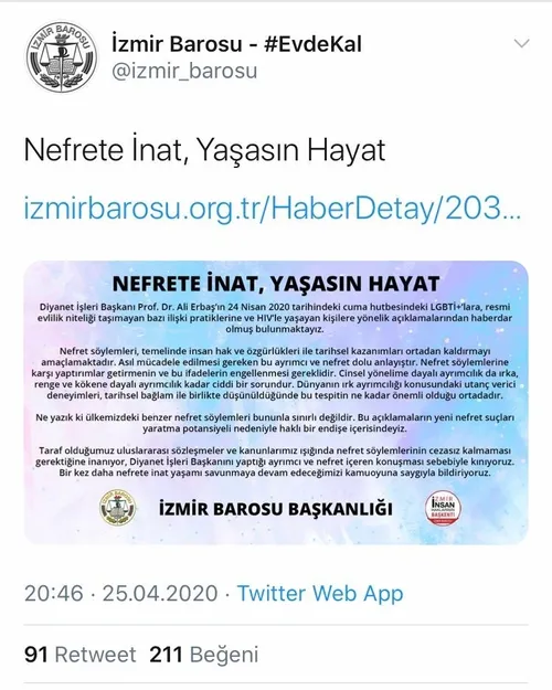 "Ankara/İzmir Baroları ile PKK'ya ve LBGT/Eşcinsellere özgürlük diyen İHD'nin suç duyurusunun bir kıymeti yoktur, zira ortada suç yoktur. Allah'ın emrini söylemek suç değil her müslümanın görevidir. Diyanet İşleri Başkanına karşı iftira ve hakaret suçu işlenmiştir."