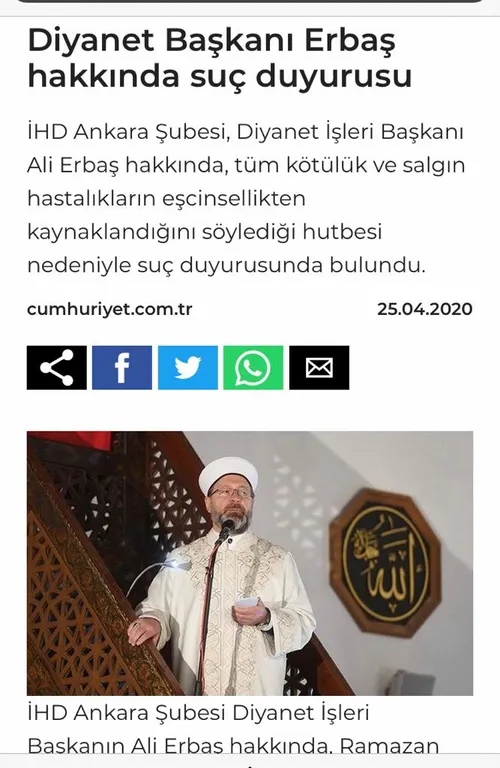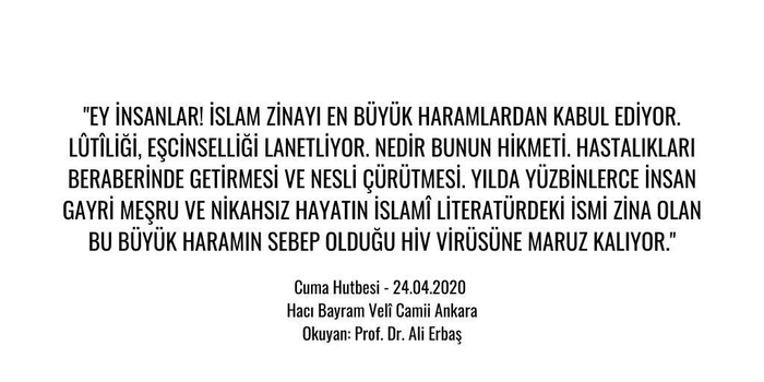 "Diyanet İşler Başkanı Ali Erbaş, Cuma Hutbesinde 'Zina haramdır' ve 'eşcinsellik sapkınlıktır' dediği için sosyal medyada linç edip, saldırıyorlar. Bu hükümler Diyanet İşleri Başkanı'nın şahsi fikirleri değil Kur'an-ı Kerim'in emirlerdir."