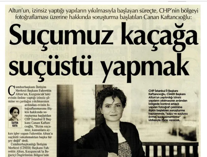 CHP'li Kaftancıoğlu, açıklamasında sanki CHP bir kolluk kuvvetiymiş gibi suçüstü yaptıkları açıklamasında bulunarak polis ya da zabıta rolüne soyundu. Kaftancıoğlu, ayrıca yine basın emekçilerini hedef aldı. Verdiği röportajda, 'Biz yapılan kanunsuzluğu yargıya taşıdık o kadar. O andan itibaren yargı aşamasına geçtik. Ama onlar tam da bu andan itibaren önce meseleyi sulandırmaya, başka alanlara çekmeye başladılar, daha sonra da medyadaki tetikçilerini üzerimize salarak, sosyal medyadaki trol orduları ile suçluluklarını örtme telaşına girdiler.' dedi.