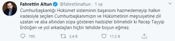 İletişim Başkanı Altun, CHP'li Özel'in konuşması esnasında ''Saray rejiminin sonu geliyor. O son Atatürk'ün kemiklerini sızlatacak bütün bu atamaların, bütün bu liyakatsizliklerin de sonunu getirecek.'' şeklindeki skandal sözlerine, ''Cumhurbaşkanımızın ve Hükümetinin meşruiyetine dil uzatan ve aba altından sopa gösteren hadsizler bilmelidir ki Recep Tayyip Erdoğan ve yol arkadaşları hiçbir tehdide boyun eğmez.'' sözleriyle cevap verdi.