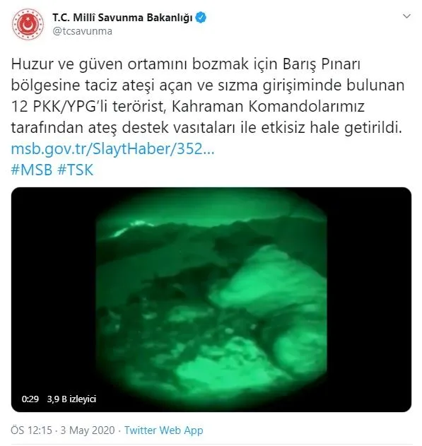 Milli Savunma Bakanlığı: Huzur ve güven ortamını bozmak için Barış Pınarı bölgesine taciz ateşi açan ve sızma girişiminde bulunan 12 PKK/YPG’li terörist, Kahraman Komandolarımız tarafından ateş destek vasıtaları ile etkisiz hale getirildi.