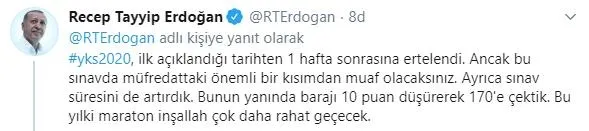"Sevgili gençler, 2020 mücadele ile geçiyor. Zorluklara millet olarak göğüs geriyoruz. Çok şükür başarımız ortada. Bu başarının altında anlık reflekslerle değil istişare ve sorumluluk bilinciyle alınan kararlar var. Bu başarının altında milletimizin her bir ferdinin imzası var." değerlendirmesinde bulunan Erdoğan, YKS 2020'nin, ilk açıklandığı tarihten 1 hafta sonrasına ertelendiğini anımsattı.