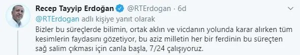 "Bizler bu süreçlerde bilimin, ortak aklın ve vicdanın yolunda karar alırken tüm kesimlerin faydasını gözetiyor, bu aziz milletin her bir ferdinin bu süreçten sağ salim çıkması için canla başla, 7/24 çalışıyoruz. Bu süreci siyasi istismara kurban etmeden, azmimizle, kararlılığımızla, birliğimize sahip çıkarak hep birlikte atlatacağımıza inancım tamdır. Gelecekte sizlere emanet edeceğimiz güçlü Türkiye'yi, birliğimizi bozmaya çalışan odaklara rağmen inşa etmeye devam edeceğiz."