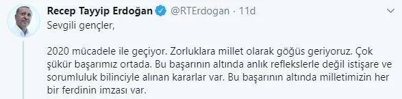 Cumhurbaşkanı Recep Tayyip Erdoğan, 2020 yılının mücadele ile geçtiğini belirterek, "Zorluklara millet olarak göğüs geriyoruz. Çok şükür başarımız ortada. Bu başarının altında anlık reflekslerle değil istişare ve sorumluluk bilinciyle alınan kararlar var." ifadelerini kullandı. Cumhurbaşkanı Erdoğan, sosyal paylaşım sitesi Twitter üzerinden gençlere böyle seslendi;