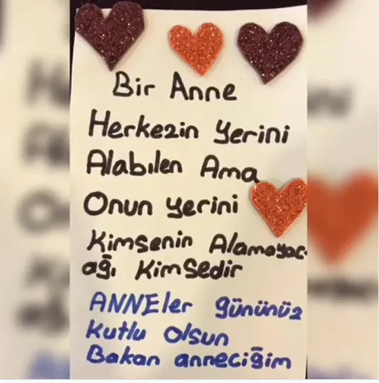 Aile, Çalışma ve Sosyal Hizmetler Bakanı Zehra Zümrüt Selçuk, Anneler Günü'nde, kuruluş bakımındaki çocukların kendisine "Bakan Anneciğim" hitabıyla yazdığı notu paylaştı.