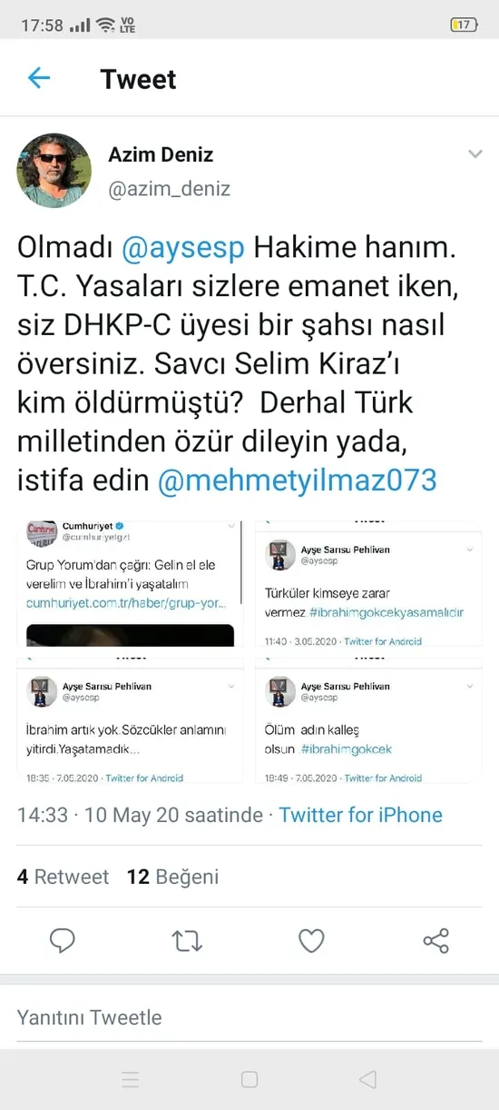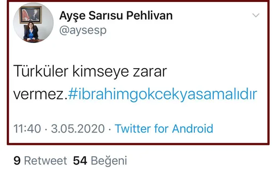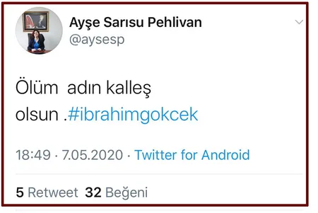 İzmir Karşıyaka Hâkimi Ayşe Sarısu Pehlivan, DHKP-C sanığı olarak yargılandığı sırada örgüt talimatıyla açlık grevine başlayıp geçtiğimiz günlerde kaldırıldığı hastanede ölen İbrahim Gökçek’in ardından ağıtlar yaktı. Hâkim Pehlivan, Twitter hesabından İbrahim Gökçek ile ilgili skandal paylaşımlarda bulundu