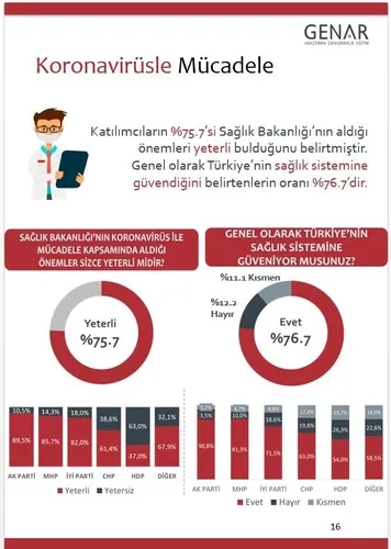 Türkiye kamuoyu hükümeti ve Sağlık Bakanlığını çok başarılı buluyor. Türkiye'nin yüzde 70'i Sağlık Bakanlığı'nın toplum ile paylaştığı verilerin güvenli olduğuna inanıyor. Yüzde 75'e Sağlık Bakanlığı'nı başarılı bulmaktadır. CHP seçmeninin yüzde 63'ü Sağlık Bakanı Fahrettin Koca'yı başarılı bulmaktadır.