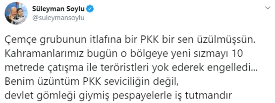 İçişleri Bakanı Süleyman Soylu, sosyal medya hesabından Gazeteci Müyesser Yıldız'a tepki gösterdi. Soylu, "Çemçe grubunun itlafına bir PKK bir sen üzülmüşsün. Kahramanlarımız bugün o bölgeye yeni sızmayı 10 metrede çatışma ile teröristleri yok ederek engelledi... Benim üzüntüm PKK seviciliğin değil, devlet gömleği giymiş pespayelerle iş tutmandır" ifadelerini kullandı.