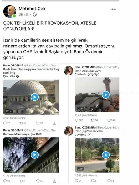İzmir'in çeşitli bölgelerindeki bazı camilerin hoparlörlerinden kimliği belirsiz kişilerce 'Çav Bella' çalınması üzerine soruşturma başlatıldı.