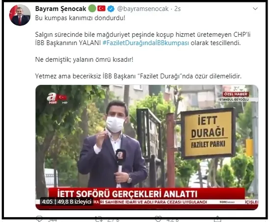 CHP'li İBB yönetiminin; Fazilet Durağı ile ilgili verdiği tüm bilgilerin asılsız olduğunu ve otobüs şoförünün de iddiaları yalanladığını vurgulayan Şenocak, "Bu kumpas kanımızı dondurdu! Salgın sürecinde bile mağduriyet peşinde koşup hizmet üretemeyen CHP'li İBB Başkanının YALANI #FaziletDurağındaİBBkumpası olarak tescillendi. Ne demiştik; yalanın ömrü kısadır! Yetmez ama beceriksiz İBB Başkanı "Fazilet Durağı"nda özür dilemelidir" çağrısında bulundu.