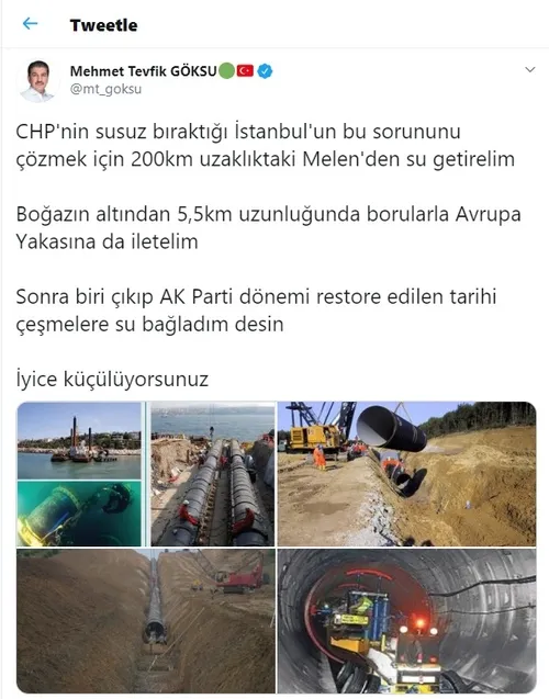 AK Parti Esenler Belediye Başkanı ve AK Parti İBB Meclisi Grup Başkanvekili Tevfik Mehmet Göksu bu duruma sert bir tepki gösterdi. Göksu twettır hesabından şunları söyledi: "CHP'nin susuz bıraktığı İstanbul'un bu sorununu çözmek için 200 km uzaklıktaki Melen'den su getirelim Boğazın altından 5,5 km uzunluğunda borularla Avrupa Yakası'na da iletelim. Sonra biri çıkıp 'AK Parti dönemi restore edilen tarihi çeşmelere su bağladım' desin. İyice küçülüyorsunuz!"