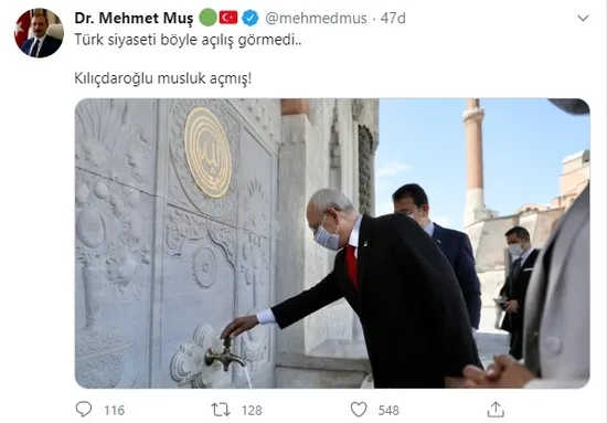 AK Parti Grup Başkanvekili Mehmet Muş, ise sosyal medya hesabından "Türk siyaseti böyle açılış görmedi, Kılıçdaroğlu musluk açmış" ifadelerini kullandı.