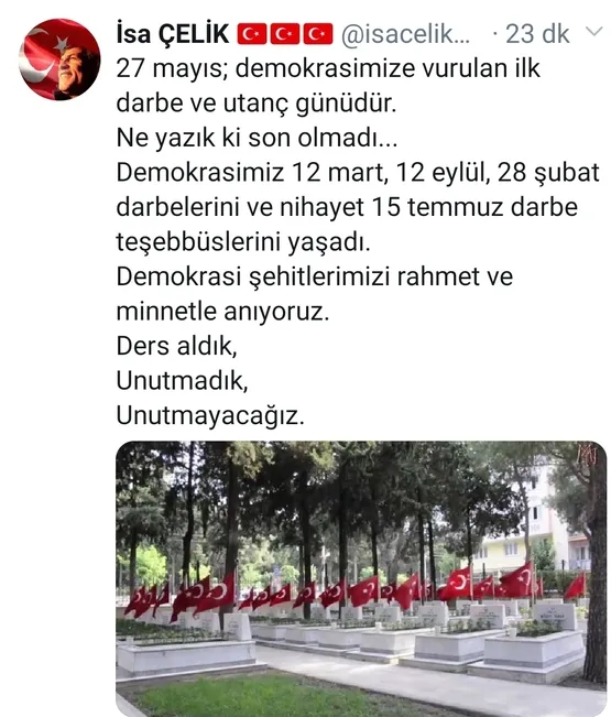Yargıtay Üyesi İsa Çelik twetterdan 27 Maysı'ın yıldönümünde paylaşımda bulundu. Çelik, :"27 mayıs; demokrasimize vurulan ilk darbe ve utanç günüdür.