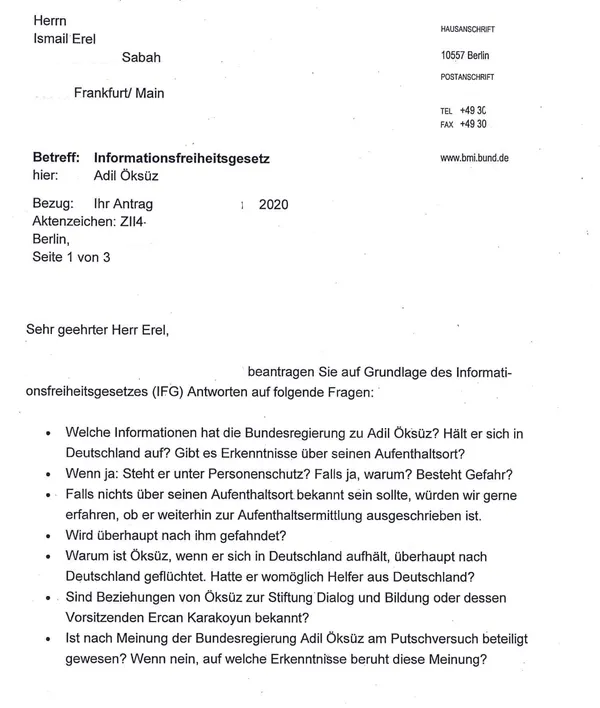 SABAH Almanya Temsilcisi İsmail Erel, Adil Öksüz ile ilgili İçişleri Bakanlığı'ndan resmi yollardan yanıt alamayınca, bu kez Bilgi Alma Özgürlüğü Yasası uyarınca bilgi istedi.