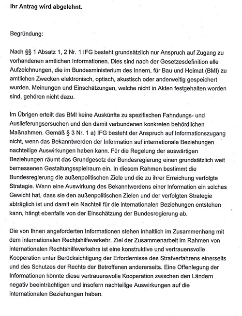 YAZILI cevapta, özetle şöyle denildi: "İstediğiniz bilgiler içerik olarak uluslararası adli yardımlaşma ile ilgili. Adli yardımlaşmanın hedefi yapıcı ve güvenilir bir işbirliğidir. Bilgilerin açıklanması, ülkeler arasındaki bu güvene dayalı işbirliğini tehlikeye sokabilir. Şahsi bilgilerin korunması yasası nedeniyle daha fazla bilgi verilmesi mümkün değil. Bu ancak, başvuru sahibinin cevap alma hakkının daha ağır basması veya kişinin buna onay vermesi halinde olabilir. Sizin durumunuzda her ikisi de sözkonusu değil."