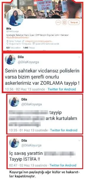 Sosyal medya hesabı üzerinden Cumhurbaşkanı Recep Tayyip Erdoğan'a defalarca ağır küfür ve hakaretler ederek, açık biçimde darbe tehdidinde bulunan CHP'li meclis üyesi Dila Koyurga gözaltında alındı. CHP, İzmir Karabağlar Belediye Meclis Üyesi ve aynı zamanda CHP Gençlik Örgütleri İzmir İl Sekreteri olan Koyurga ve CHP İl Başkan Yardımcısı Yasin Ergül'ün, Cumhurbaşkanı Recep Tayyip Erdoğan'a ağza alınmayacak hakaretler içeren paylaşımları ortaya çıktı. Erdoğan'ın avukatı Ahmet Özel, iki isim hakkında da İzmir Cumhuriyet Başsavcılığı'na suç duyurusunda bulunurken, Koyurga gözaltında alındı.