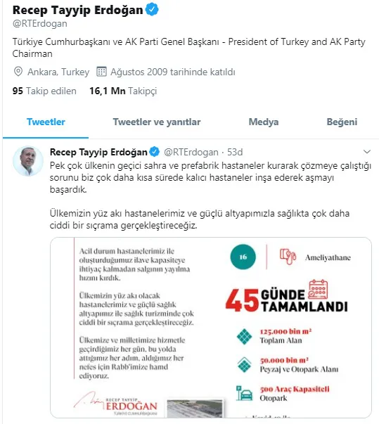 Erdoğan, sosyal medya hesaplarından, "Pek çok ülkenin geçici sahra ve prefabrik hastaneler kurarak çözmeye çalıştığı sorunu biz çok daha kısa sürede kalıcı hastaneler inşa ederek aşmayı başardık. Ülkemizin yüz akı hastanelerimiz ve güçlü altyapımızla sağlıkta çok daha ciddi bir sıçrama gerçekleştireceğiz." ifadelerini paylaştı.